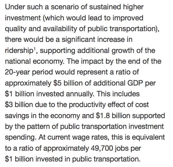 Investment in public transit can yield 49,700 jobs per $1 billion invested, and offers a 5 to 1 economic return.