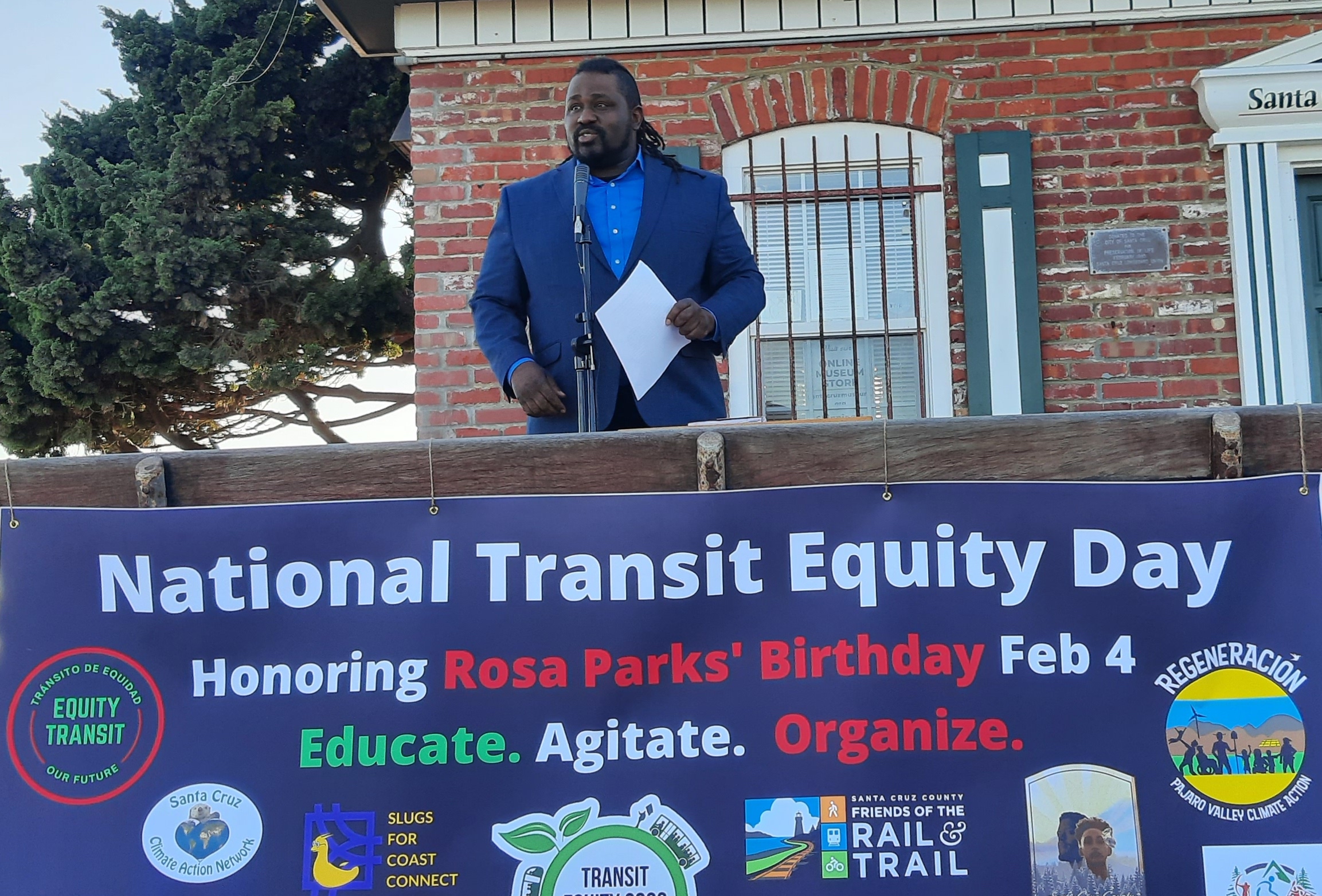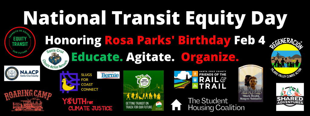 Local Sponsors/Endorsers of Santa Cruz County’s Transit Equity Day included Equity Transit, the Santa Cruz NAACP, the Santa Cruz Climate Action Network, Roaring Camp, Regeneración, Santa Cruz County Black Health Matters Initiative, the Youth for Climate Action Network, Shared Adventures, the Black Student Union, Slugs for Coast Connect, Friends of the Rail and Trail, and Santa Cruz for Bernie. A special thanks to the City of Santa Cruz Parks and Recreation.